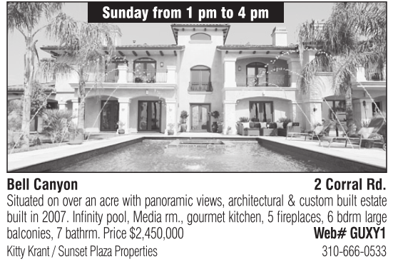 Sunday from 1 pm to 4 pm Kitty Krant / Sunset Plaza Properties 310-666-0533 Bell Canyon 2 Corral Rd. Situated on over an acre with panoramic views, architectural & custom built estate built in 2007. Infinity pool, Media rm., gourmet kitchen, 5 fireplaces, 6 bdrm large balconies, 7 bathrm. Price $2,450,000 Web# GUXY1