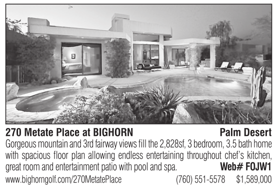 270 Metate Place at BIGHORN Palm Desert Gorgeous mountain and 3rd fairway views fill the 2,828sf, 3 bedroom, 3.5 bath home with spacious floor plan allowing endless entertaining throughout chef’s kitchen, great room and entertainment patio with pool and spa. Web# FOJW1 www.bighorngolf.com/270MetatePlace (760) 551-5578 $1,589,000