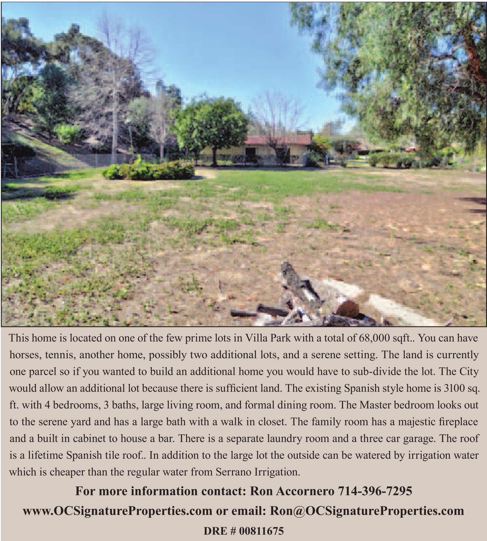 This home is located on one of the few prime lots in Villa Park with a total of 68,000 sqft.. You can have horses, tennis, another home, possibly two additional lots, and a serene setting. The land is currently one parcel so if you wanted to build an additional home you would have to sub-divide the lot. The City would allow an additional lot because there is sufficient land. The existing Spanish style home is 3100 sq. ft. with 4 bedrooms, 3 baths, large living room, and formal dining room. The Master bedroom looks out to the serene yard and has a large bath with a walk in closet. The family room has a majestic fireplace and a built in cabinet to house a bar. There is a separate laundry room and a three car garage. The roof is a lifetime Spanish tile roof.. In addition to the large lot the outside can be watered by irrigation water which is cheaper than the regular water from Serrano Irrigation. For more information contact: Ron Accornero 714-396-7295 www.OCSignatureProperties.com or email: Ron@OCSignatureProperties.com DRE # 00811675