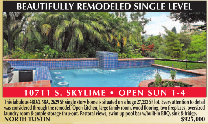 This fabulous 4BD/2.5BA, 2629 SF single story home is situated on a huge 27,253 SF lot. Every attention to detail was considered through the remodel. Open kitchen, large family room, wood flooring, two fireplaces, oversized laundry room & ample storage thru-out. Pastoral views, swim up pool bar w/built-in BBQ, sink & fridge. NORTH TUSTIN $925,000