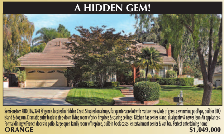 Semi-custom 4BD/3BA, 3241 SF gem is located in Hidden Crest. Situated on a huge, flat quarter acre lot with mature trees, lots of grass, a swimming pool/spa, built-in BBQ island & dog run. Dramatic entry leads to step-down living room w/brick fireplace & soaring ceilings. Kitchen has center island, dual pantry & newer Jenn-Air appliances. Formal dining w/French doors to patio, large open family room w/fireplace, built-in book cases, entertainment center & wet bar. Perfect entertaining home! ORANGE $1,049,000