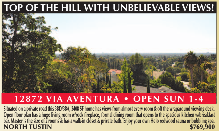 Situated on a private road this 3BD/3BA, 3408 SF home has views from almost every room & off the wraparound viewing deck. Open floor plan has a huge living room w/rock fireplace, formal dining room that opens to the spacious kitchen w/breakfast bar. Master is the size of 2 rooms & has a walk-in closet & private bath. Enjoy your own Helo redwood sauna or bubbling spa. NORTH TUSTIN $769,900