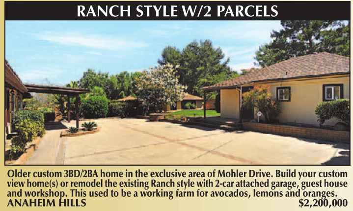 Older custom 3BD/2BA home in the exclusive area of Mohler Drive. Build your custom view home(s) or remodel the existing Ranch style with 2-car attached garage, guest house and workshop. This used to be a working farm for avocados, lemons and oranges. ANAHEIM HILLS $2,200,000