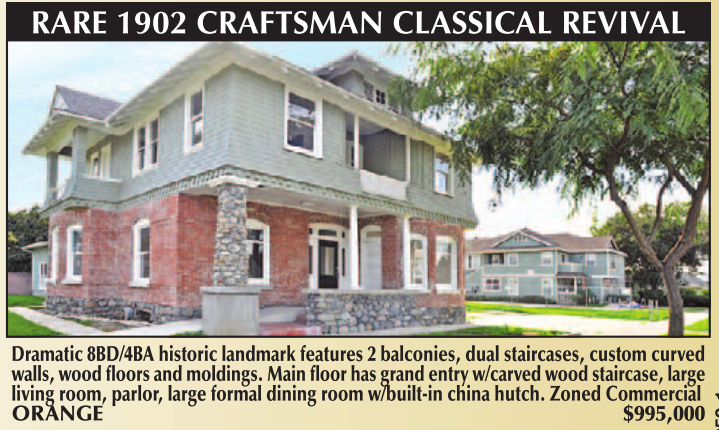Dramatic 8BD/4BA historic landmark features 2 balconies, dual staircases, custom curved walls, wood floors and moldings. Main floor has grand entry w/carved wood staircase, large living room, parlor, large formal dining room w/built-in china hutch. Zoned Commercial ORANGE $995,000