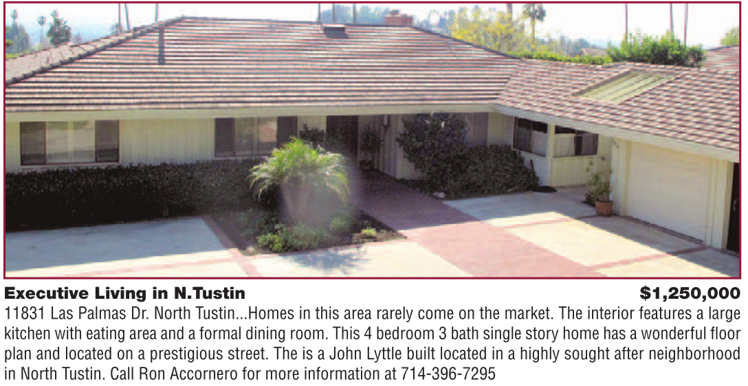Executive Living in N.Tustin $1,250,000 11831 Las Palmas Dr. North Tustin...Homes in this area rarely come on the market. The interior features a large kitchen with eating area and a formal dining room. This 4 bedroom 3 bath single story home has a wonderful floor plan and located on a prestigious street. The is a John Lyttle built located in a highly sought after neighborhood in North Tustin. Call Ron Accornero for more information at 714-396-7295