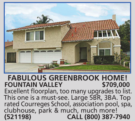 FABULOUS GREENBROOK HOME! FOUNTAIN VALLEY $709,000 Excellent floorplan, too many upgrades to list. This one is a must-see. Large 5BR, 3BA. Top rated Courreges School, association pool, spa, clubhouse, park & much, much more! (521198) CALL (800) 387-7940