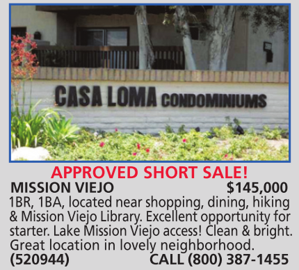 APPROVED SHORT SALE! MISSION VIEJO $145,000 1BR, 1BA, located near shopping, dining, hiking & Mission Viejo Library. Excellent opportunity for starter. Lake Mission Viejo access! Clean & bright. Great location in lovely neighborhood. (520944) CALL (800) 387-1455