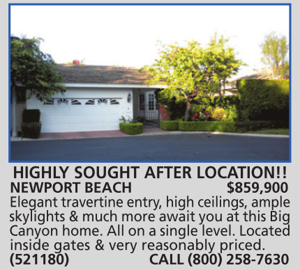 HIGHLY SOUGHT AFTER LOCATION!! NEWPORT BEACH $859,900 Elegant travertine entry, high ceilings, ample skylights & much more await you at this Big Canyon home. All on a single level. Located inside gates & very reasonably priced. (521180) CALL (800) 258-7630