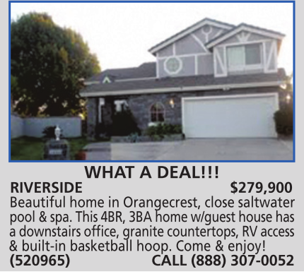WHAT A DEAL!!! RIVERSIDE $279,900 Beautiful home in Orangecrest, close saltwater pool & spa. This 4BR, 3BA home w/guest house has a downstairs office, granite countertops, RV access & built-in basketball hoop. Come & enjoy! (520965) CALL (888) 307-0052