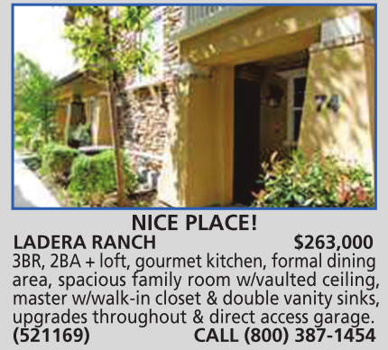 LADERA RANCH $263,000 3BR, 2BA + loft, gourmet kitchen, formal dining area, spacious family room w/vaulted ceiling, master w/walk-in closet & double vanity sinks, upgrades throughout & direct access garage.