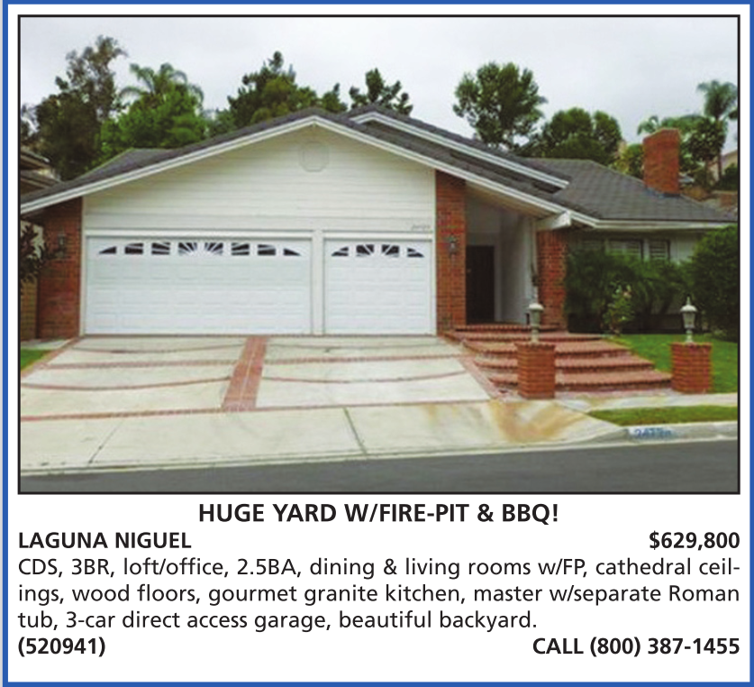 HUGE YARD W/FIRE-PIT & BBQ! LAGUNA NIGUEL $629,800 CDS, 3BR, loft/office, 2.5BA, dining & living rooms w/FP, cathedral ceilings, wood floors, gourmet granite kitchen, master w/separate Roman tub, 3-car direct access garage, beautiful backyard. (520941) CALL (800) 387-1455