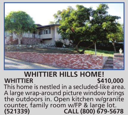 WHITTIER $410,000 This home is nestled in a secluded-like area. A large wrap-around picture window brings the outdoors in. Open kitchen w/granite counter, family room w/FP & large lot. (521339) CALL (800) 679-5678