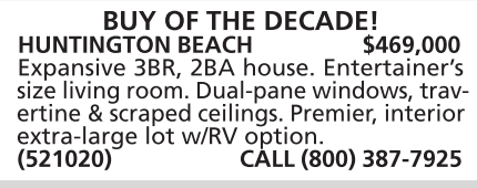 HUNTINGTON BEACH $469,000 Expansive 3BR, 2BA house. Entertainer’s size living room. Dual-pane windows, travertine & scraped ceilings. Premier, interior extra-large lot w/RV option. (521020) CALL (800) 387-7925