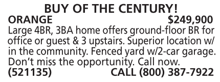 BUY OF THE CENTURY! ORANGE $249,900 Large 4BR, 3BA home offers ground-floor BR for office or guest & 3 upstairs. Superior location w/ in the community. Fenced yard w/2-car garage. Don’t miss the opportunity. Call now. (521135) CALL (800) 387-7922 SINGLE-LEVEL VIEW HOME!