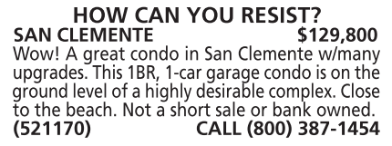 HOW CAN YOU RESIST? SAN CLEMENTE $129,800 Wow! A great condo in San Clemente w/many upgrades. This 1BR, 1-car garage condo is on the ground level of a highly desirable complex. Close to the beach. Not a short sale or bank owned. (521170) CALL (800) 387-1454 HONEY, STOP THE CAR!
