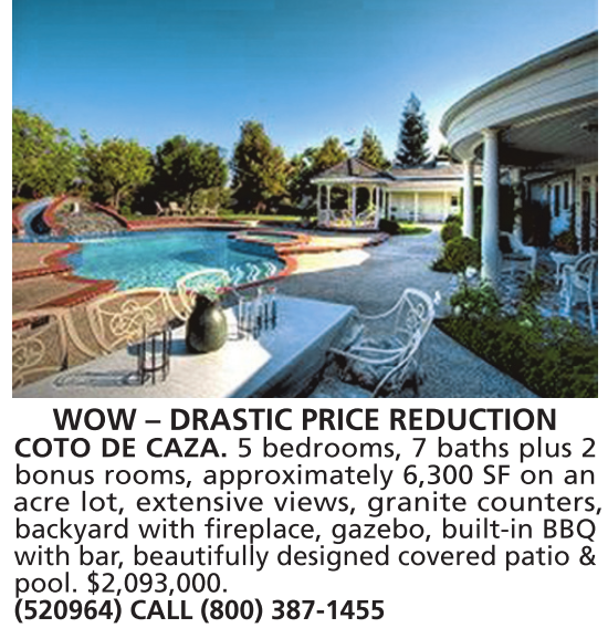 WOW – DRASTIC PRICE REDUCTION COTO DE CAZA. 5 bedrooms, 7 baths plus 2 bonus rooms, approximately 6,300 SF on an acre lot, extensive views, granite counters, backyard with fireplace, gazebo, built-in BBQ with bar, beautifully designed covered patio & pool. $2,093,000. (520964) CALL (800) 387-1455