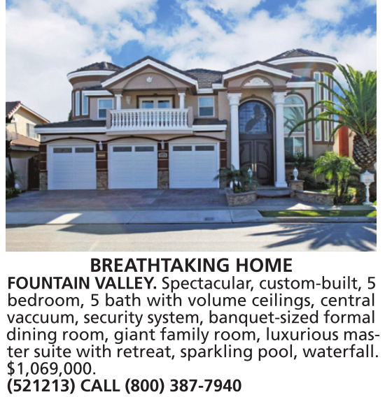 BREATHTAKING HOME FOUNTAIN VALLEY. Spectacular, custom-built, 5 bedroom, 5 bath with volume ceilings, central vaccuum, security system, banquet-sized formal dining room, giant family room, luxurious master suite with retreat, sparkling pool, waterfall.