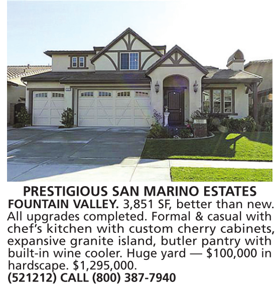 PRESTIGIOUS SAN MARINO ESTATES FOUNTAIN VALLEY. 3,851 SF, better than new. All upgrades completed. Formal & casual with chef’s kitchen with custom cherry cabinets, expansive granite island, butler pantry with built-in wine cooler. Huge yard — $100,000 in hardscape. $1,295,000. (521212) CALL (800) 387-7940