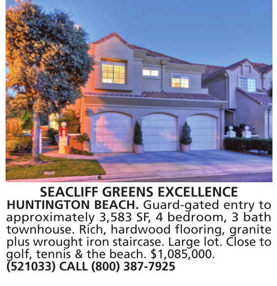 cabinets, SEACLIFF GREENS EXCELLENCE HUNTINGTON BEACH. Guard-gated entry to approximately 3,583 SF, 4 bedroom, 3 bath townhouse. Rich, hardwood flooring, granite plus wrought iron staircase. Large lot. Close to golf, tennis & the beach. $1,085,000. (521033) CALL (800) 387-7925