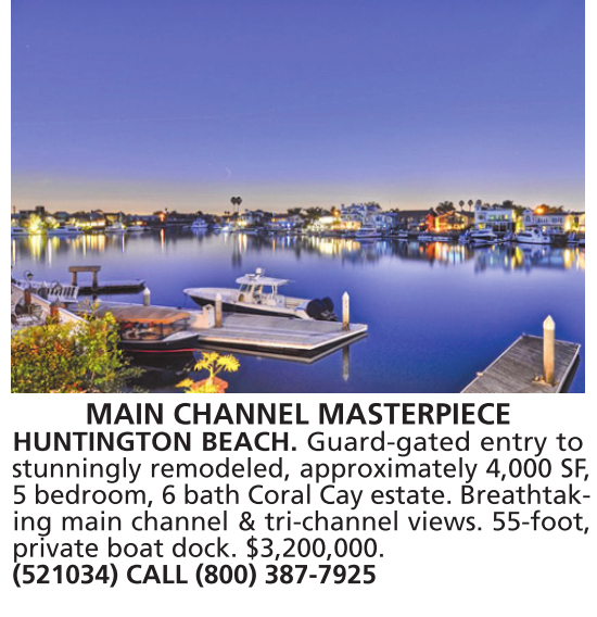 MAIN CHANNEL MASTERPIECE HUNTINGTON BEACH. Guard-gated entry to stunningly remodeled, approximately 4,000 SF, 5 bedroom, 6 bath Coral Cay estate. Breathtaking main channel & tri-channel views. 55-foot, private boat dock. $3,200,000. (521034) CALL (800) 387-7925