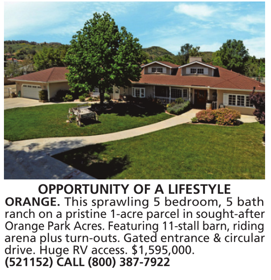 OPPORTUNITY OF A LIFESTYLE ORANGE. This sprawling 5 bedroom, 5 bath ranch on a pristine 1-acre parcel in sought-after Orange Park Acres. Featuring 11-stall barn, riding arena plus turn-outs. Gated entrance & circular drive. Huge RV access. $1,595,000. (521152) CALL (800) 387-7922