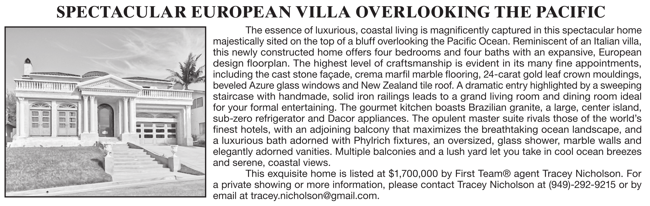 SPECTACULAR EUROPEAN VILLA OVERLOOKING THE PACIFIC The essence of luxurious, coastal living is magnificently captured in this spectacular home majestically sited on the top of a bluff overlooking the Pacific Ocean. Reminiscent of an Italian villa, this newly constructed home offers four bedrooms and four baths with an expansive, European design floorplan. The highest level of craftsmanship is evident in its many fine appointments, including the cast stone façade, crema marfil marble flooring, 24-carat gold leaf crown mouldings, beveled Azure glass windows and New Zealand tile roof. A dramatic entry highlighted by a sweeping staircase with handmade, solid iron railings leads to a grand living room and dining room ideal for your formal entertaining. The gourmet kitchen boasts Brazilian granite, a large, center island, sub-zero refrigerator and Dacor appliances. The opulent master suite rivals those of the world’s finest hotels, with an adjoining balcony that maximizes the breathtaking ocean landscape, and a luxurious bath adorned with Phylrich fixtures, an oversized, glass shower, marble walls and elegantly adorned vanities. Multiple balconies and a lush yard let you take in cool ocean breezes and serene, coastal views. This exquisite home is listed at $1,700,000 by First Team® agent Tracey Nicholson. For a private showing or more information, please contact Tracey Nicholson at (949)-292-9215 or by email at tracey.nicholson@gmail.com.
