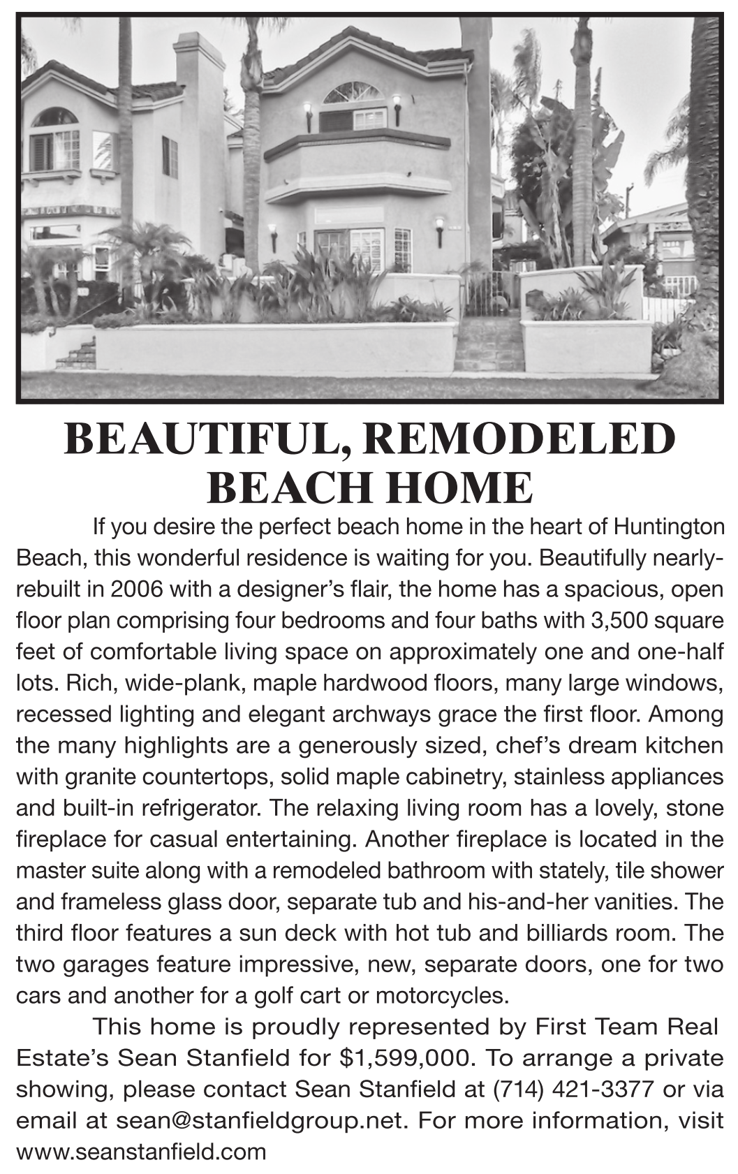 This home is proudly represented by First Team Real Estate’s Sean Stanfield for $1,599,000. To arrange a private showing, please contact Sean Stanfield at (714) 421-3377 or via email at sean@stanfieldgroup.net. For more information, visit www.seanstanfield.com