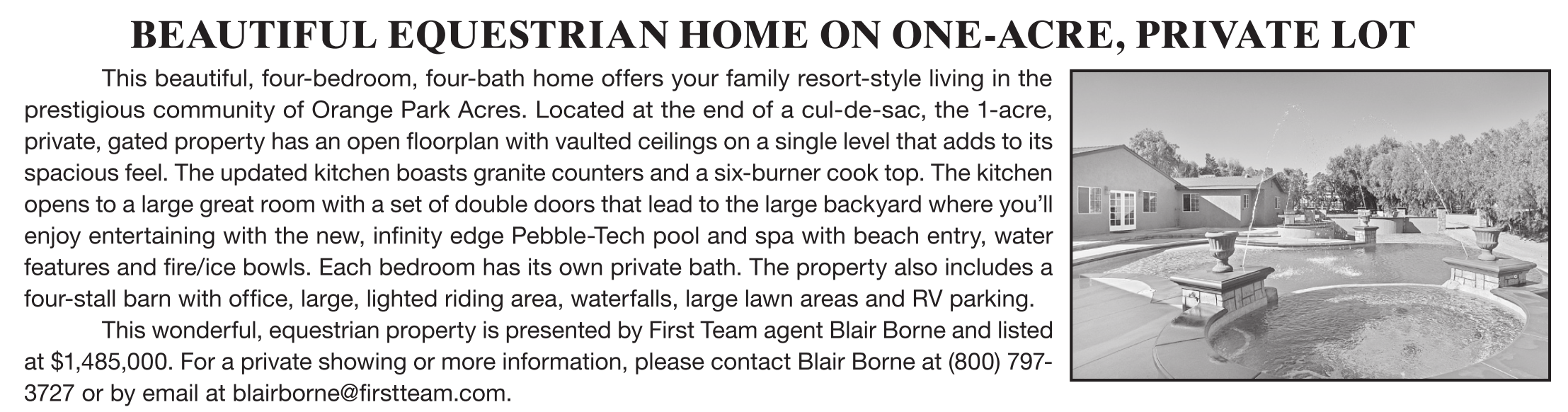 BEAUTIFUL EQUESTRIAN HOME ON ONE-ACRE, PRIVATE LOT This beautiful, four-bedroom, four-bath home offers your family resort-style living in the prestigious community of Orange Park Acres. Located at the end of a cul-de-sac, the 1-acre, private, gated property has an open floorplan with vaulted ceilings on a single level that adds to its spacious feel. The updated kitchen boasts granite counters and a six-burner cook top. The kitchen opens to a large great room with a set of double doors that lead to the large backyard where you’ll enjoy entertaining with the new, infinity edge Pebble-Tech pool and spa with beach entry, water features and fire/ice bowls. Each bedroom has its own private bath. The property also includes a four-stall barn with office, large, lighted riding area, waterfalls, large lawn areas and RV parking. This wonderful, equestrian property is presented by First Team agent Blair Borne and listed at $1,485,000. For a private showing or more information, please contact Blair Borne at (800) 797- 3727 or by email at blairborne@firstteam.com.