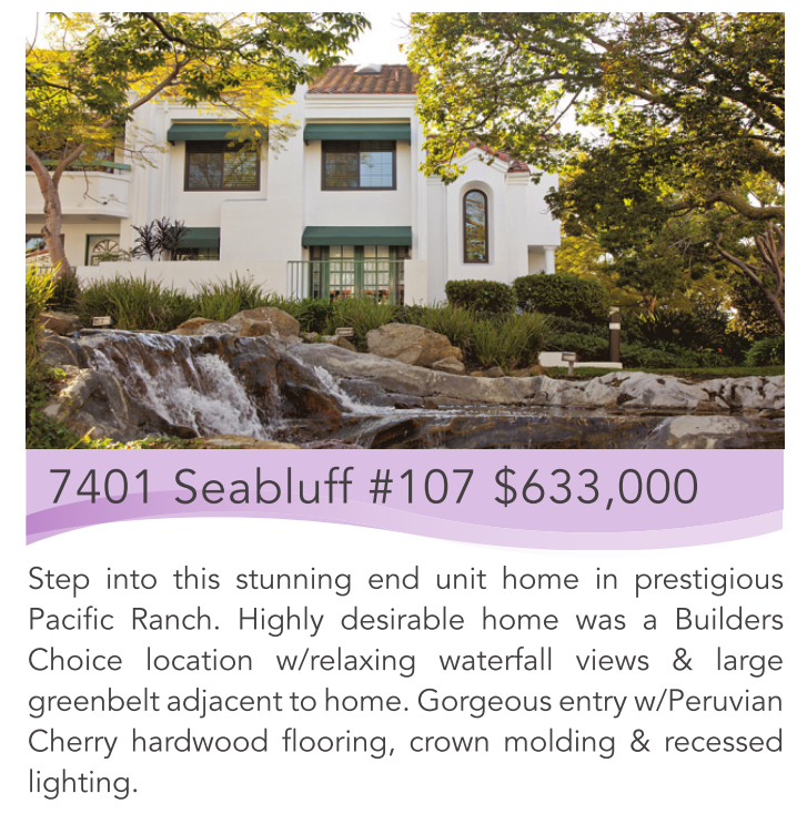 7401 Seabluff #107 $633,000 Step into this stunning end unit home in prestigious Pacific Ranch. Highly desirable home was a Builders Choice location w/relaxing waterfall views & large greenbelt adjacent to home. Gorgeous entry w/Peruvian Cherry hardwood flooring, crown molding & recessed lighting.
