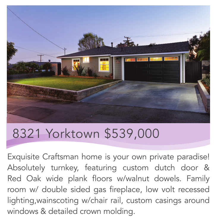 8321 Yorktown $539,000 Exquisite Craftsman home is your own private paradise! Absolutely turnkey, featuring custom dutch door & Red Oak wide plank floors w/walnut dowels. Family room w/ double sided gas fireplace, low volt recessed lighting,wainscoting w/chair rail, custom casings around windows & detailed crown molding.