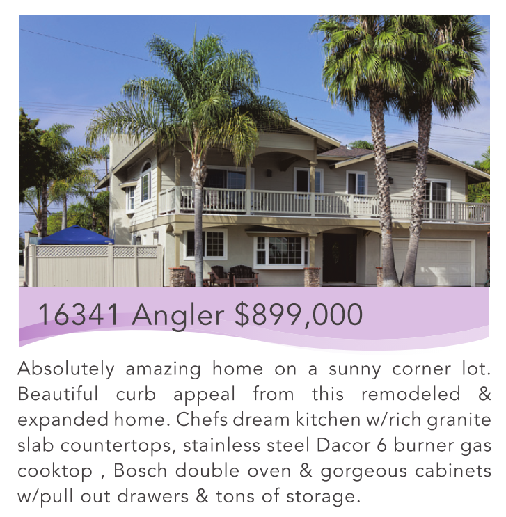 16341 Angler $899,000 Absolutely amazing home on a sunny corner lot. Beautiful curb appeal from this remodeled & expanded home. Chefs dream kitchen w/rich granite slab countertops, stainless steel Dacor 6 burner gas cooktop , Bosch double oven & gorgeous cabinets w/pull out drawers & tons of storage.
