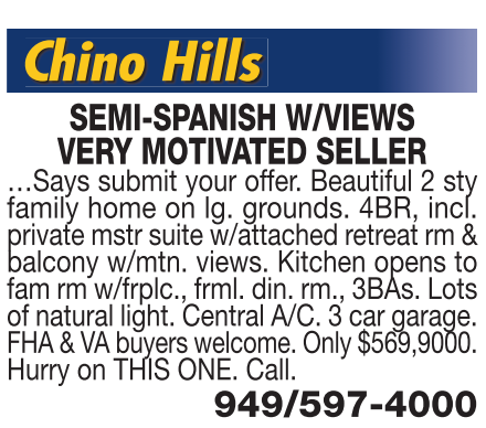Chino Hills SEMI-SPANISH W/VIEWS VERY MOTIVATED SELLER …Says submit your offer. Beautiful 2 sty family home on lg. grounds. 4BR, incl. private mstr suite w/attached retreat rm & balcony w/mtn. views. Kitchen opens to fam rm w/frplc., frml. din. rm., 3BAs. Lots of natural light. Central A/C. 3 car garage. FHA & VA buyers welcome. Only $569,9000. Hurry on THIS ONE. Call. 949/597-4000