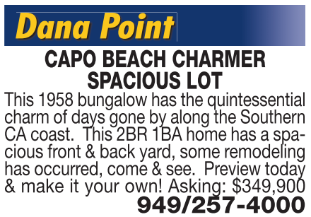 CAPO BEACH CHARMER SPACIOUS LOT This 1958 bungalow has the quintessential charm of days gone by along the Southern CA coast. This 2BR 1BA home has a spacious front & back yard, some remodeling has occurred, come & see. Preview today & make it your own! Asking: $349,900 949/257-4000