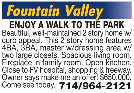 ENJOY A WALK TO THE PARK Beautiful, well-maintained 2 story home w/ curb appeal. This 2 story home features 4BA, 3BA, master w/dressing area w/ two large closets. Spacious living room. Fireplace in family room. Open kitchen, Close to FV hospital, shopping & freeway. Owner says make me an offer! $650,000. Come see today. 714/964-2121