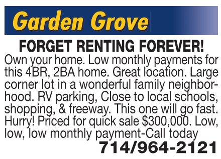 garage. $569,9000. Garden Grove FORGET RENTING FOREVER! Own your home. Low monthly payments for this 4BR, 2BA home. Great location. Large corner lot in a wonderful family neighborhood. RV parking, Close to local schools, shopping, & freeway. This one will go fast. Hurry! Priced for quick sale $300,000. Low, low, low monthly payment-Call today 714/964-2121