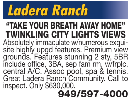 “TAKE YOUR BREATH AWAY HOME” TWINKLING CITY LIGHTS VIEWS Absolutely immaculate w/numerous exquisite highly upgd features. Premium view grounds. Features stunning 2 sty, 5BR include office, 3BA, sep fam rm, w/frplc, central A/C. Assoc pool, spa & tennis. Great Ladera Ranch Community. Call to inspect. Only $630,000.