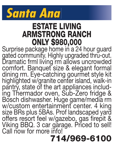Santa Ana ESTATE LIVING ARMSTRONG RANCH ONLY $980,000 Surprise package home in a 24 hour guard gated community. Highly upgraded thru-out. Dramatic frml living rm allows uncrowded comfort. Banquet size & elegant formal dining rm. Eye-catching gourmet style kit highlighted w/granite center island, walk-in pantry, state of the art appliances including Thermador oven, Sub-Zero fridge & Bosch dishwasher. Huge game/media rm w/custom entertainment center. 4 king size BRs plus 5BAs. Prof landscaped yard offers resort feel w/gazebo, gas firepit & Viking BBQ. 3 car garage. Priced to sell! Call now for more info! 714/969-6100