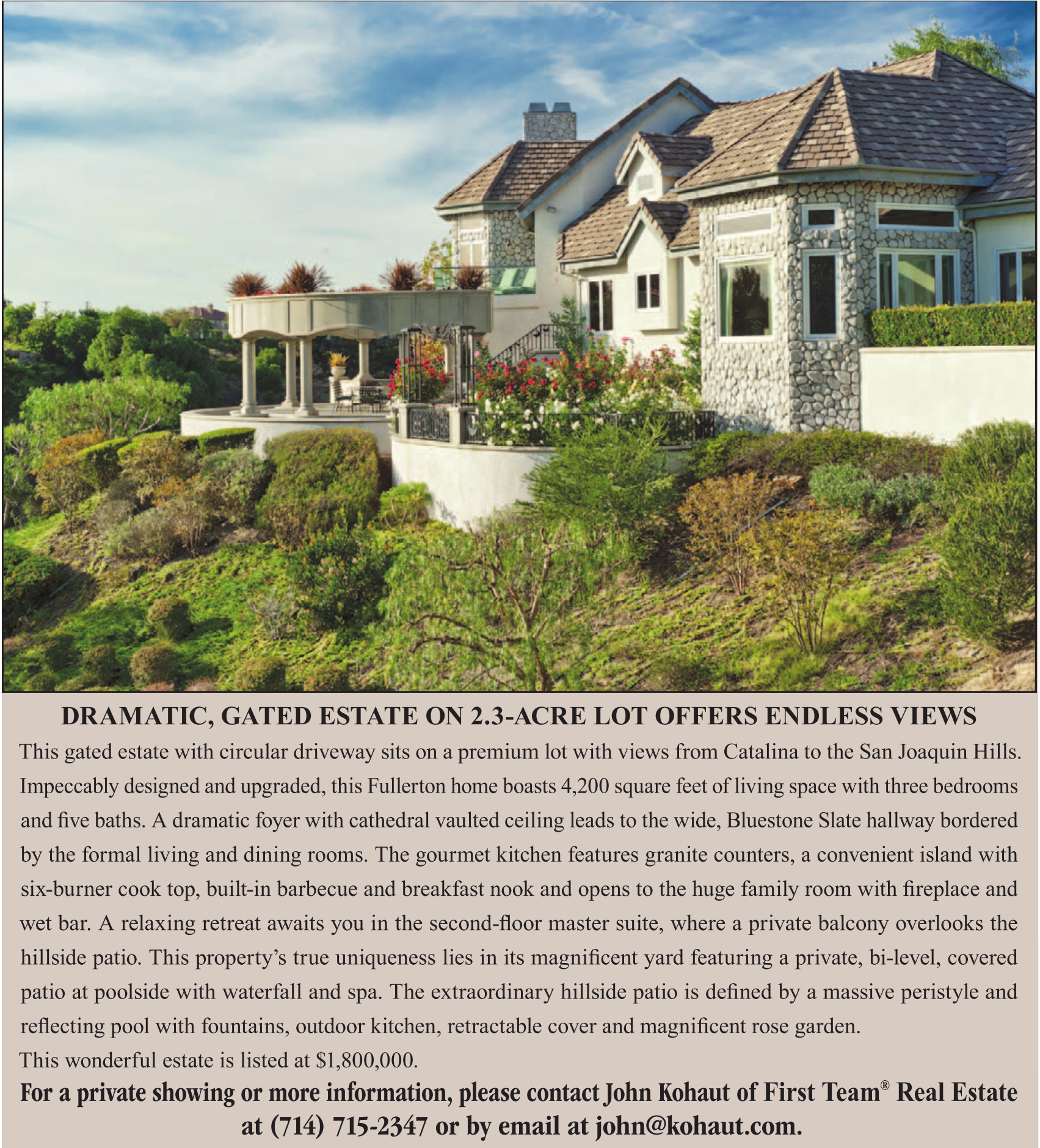 DRAMATIC, GATED ESTATE ON 2.3-ACRE LOT OFFERS ENDLESS VIEWS This gated estate with circular driveway sits on a premium lot with views from Catalina to the San Joaquin Hills. Impeccably designed and upgraded, this Fullerton home boasts 4,200 square feet of living space with three bedrooms and five baths. A dramatic foyer with cathedral vaulted ceiling leads to the wide, Bluestone Slate hallway bordered by the formal living and dining rooms. The gourmet kitchen features granite counters, a convenient island with six-burner cook top, built-in barbecue and breakfast nook and opens to the huge family room with fireplace and wet bar. A relaxing retreat awaits you in the second-floor master suite, where a private balcony overlooks the hillside patio. This property’s true uniqueness lies in its magnificent yard featuring a private, bi-level, covered patio at poolside with waterfall and spa. The extraordinary hillside patio is defined by a massive peristyle and reflecting pool with fountains, outdoor kitchen, retractable cover and magnificent rose garden. This wonderful estate is listed at $1,800,000. For a private showing or more information, please contact John Kohaut of First Team ® Real Estate at (714) 715-2347 or by email at john@kohaut.com.