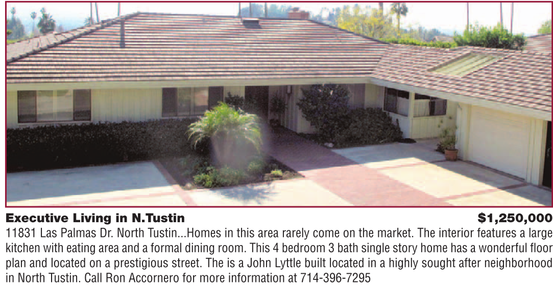 Executive Living in N.Tustin $1,250,000 11831 Las Palmas Dr. North Tustin...Homes in this area rarely come on the market. The interior features a large kitchen with eating area and a formal dining room. This 4 bedroom 3 bath single story home has a wonderful floor plan and located on a prestigious street. The is a John Lyttle built located in a highly sought after neighborhood in North Tustin. Call Ron Accornero for more information at 714-396-7295