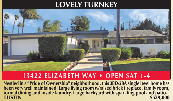 Nestled in a “Pride of Ownership” neighborhood, this 3BD/2BA single level home has been very well maintained. Large living room w/raised brick fireplace, family room, formal dining and inside laundry. Large backyard with sparkling pool and patio. TUSTIN $539,000