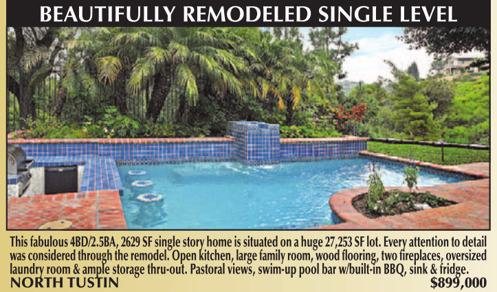 BEAUTIFULLY REMODELED SINGLE LEVEL This fabulous 4BD/2.5BA, 2629 SF single story home is situated on a huge 27,253 SF lot. Every attention to detail was considered through the remodel. Open kitchen, large family room, wood flooring, two fireplaces, oversized laundry room & ample storage thru-out. Pastoral views, swim-up pool bar w/built-in BBQ, sink & fridge. NORTH TUSTIN $899,000