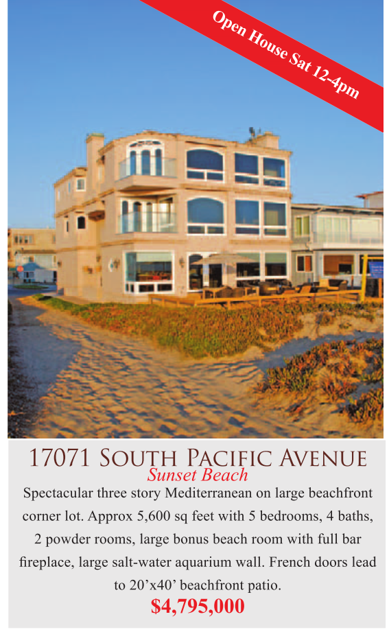 Spectacular three story Mediterranean on large beachfront corner lot. Approx 5,600 sq feet with 5 bedrooms, 4 baths, 2 powder rooms, large bonus beach room with full bar fireplace, large salt-water aquarium wall. French doors lead to 20’x40’ beachfront patio.