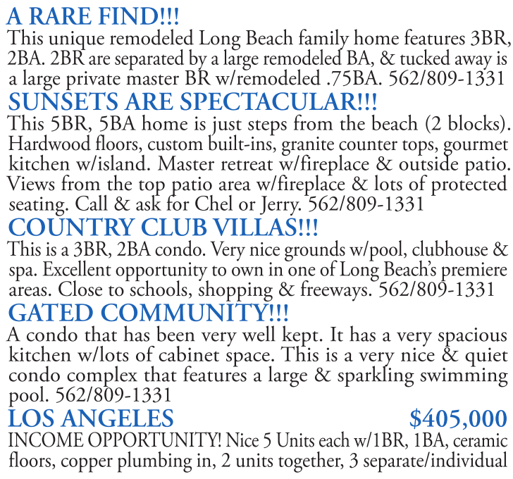 Views from the top patio area w/fireplace & lots of protected seating. Call & ask for Chel or Jerry. 562/809-1331 COUNTRY CLUB VILLAS!!! This is a 3BR, 2BA condo. Very nice grounds w/pool, clubhouse & spa. Excellent opportunity to own in one of Long Beach’s premiere areas. Close to schools, shopping & freeways. 562/809-1331 GATED COMMUNITY!!! A condo that has been very well kept. It has a very spacious kitchen w/lots of cabinet space. This is a very nice & quiet condo complex that features a large & sparkling swimming pool. 562/809-1331 LOS ANGELES $405,000 INCOME OPPORTUNITY! Nice 5 Units each w/1BR, 1BA, ceramic floors, copper plumbing in, 2 units together, 3 separate/individual