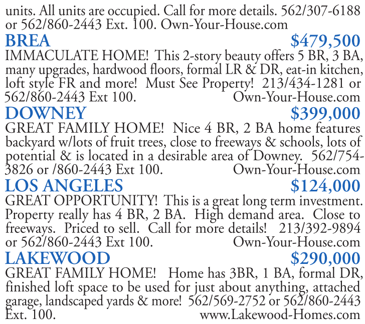 units. All units are occupied. Call for more details. 562/307-6188 or 562/860-2443 Ext. 100. Own-Your-House.com BREA $479,500 IMMACULATE HOME! This 2-story beauty offers 5 BR, 3 BA, many upgrades, hardwood floors, formal LR & DR, eat-in kitchen, loft style FR and more! Must See Property! 213/434-1281 or 562/860-2443 Ext 100. Own-Your-House.com DOWNEY $399,000 GREAT FAMILY HOME! Nice 4 BR, 2 BA home features backyard w/lots of fruit trees, close to freeways & schools, lots of potential & is located in a desirable area of Downey. 562/754- 3826 or /860-2443 Ext 100. Own-Your-House.com LOS ANGELES $124,000 GREAT OPPORTUNITY! This is a great long term investment. Property really has 4 BR, 2 BA. High demand area. Close to freeways. Priced to sell. Call for more details! 213/392-9894 or 562/860-2443 Ext 100. Own-Your-House.com LAKEWOOD $290,000 GREAT FAMILY HOME! Home has 3BR, 1 BA, formal DR, finished loft space to be used for just about anything, attached garage, landscaped yards & more! 562/569-2752 or 562/860-2443 Ext. 100. www.Lakewood-Homes.com