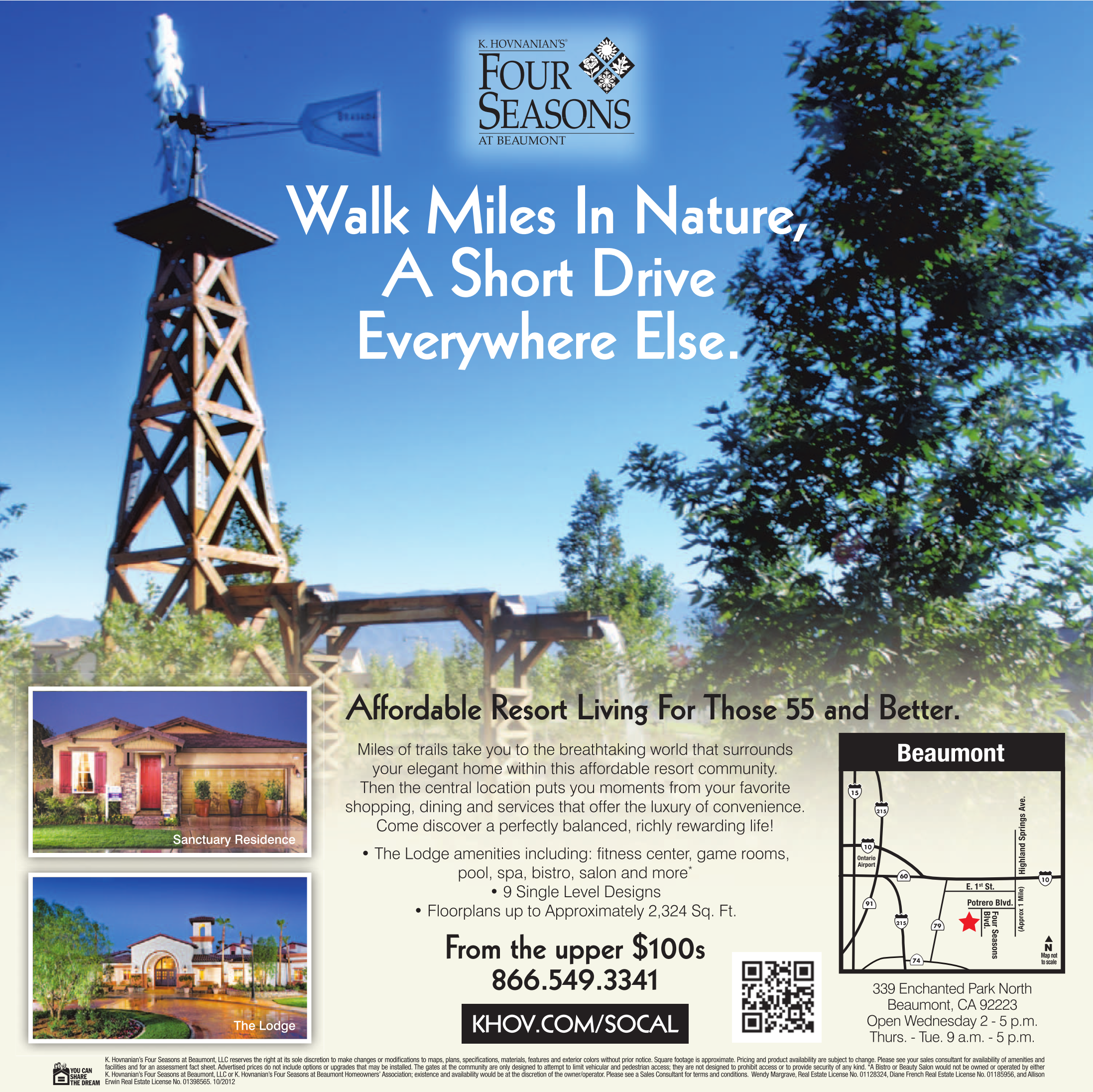 Walk Miles In Nature, A Short Drive Everywhere Else. Sanctuary Residence The Lodge Affordable Resort Living For Those 55 and Better. Miles of trails take you to the breathtaking world that surrounds your elegant home within this affordable resort community. Then the central location puts you moments from your favorite shopping, dining and services that offer the luxury of convenience. Come discover a perfectly balanced, richly rewarding life! • The Lodge amenities including: fitness center, game rooms, pool, spa, bistro, salon and more * • 9 Single Level Designs • Floorplans up to Approximately 2,324 Sq. Ft. From the upper $100s 866.549.3341 KHOV.COM/SOCAL Ontario Airport E. 1 st St. Potrero Blvd. 339 Enchanted Park North Beaumont, CA 92223 Open Wednesday 2 - 5 p.m. Thurs. - Tue. 9 a.m. - 5 p.m. K. Hovnanian’s Four Seasons at Beaumont, LLC reserves the right at its sole discretion to make changes or modifications to maps, plans, specifications, materials, features and exterior colors without prior notice. Square footage is approximate. Pricing and product availability are subject to change. Please see your sales consultant for availability of amenities and facilities and for an assessment fact sheet. Advertised prices do not include options or upgrades that may be installed. The gates at the community are only designed to attempt to limit vehicular and pedestrian access; they are not designed to prohibit access or to provide security of any kind. *A Bistro or Beauty Salon would not be owned or operated by either K. Hovnanian’s Four Seasons at Beaumont, LLC or K. Hovnanian’s Four Seasons at Beaumont Homeowners’ Association; existence and availability would be at the discretion of the owner/operator. Please see a Sales Consultant for terms and conditions. Wendy Margrave, Real Estate License No. 01128324, Diane French Real Estate License No. 01185956, and Allison Erwin Real Estate License No. 01398565. 10/2012