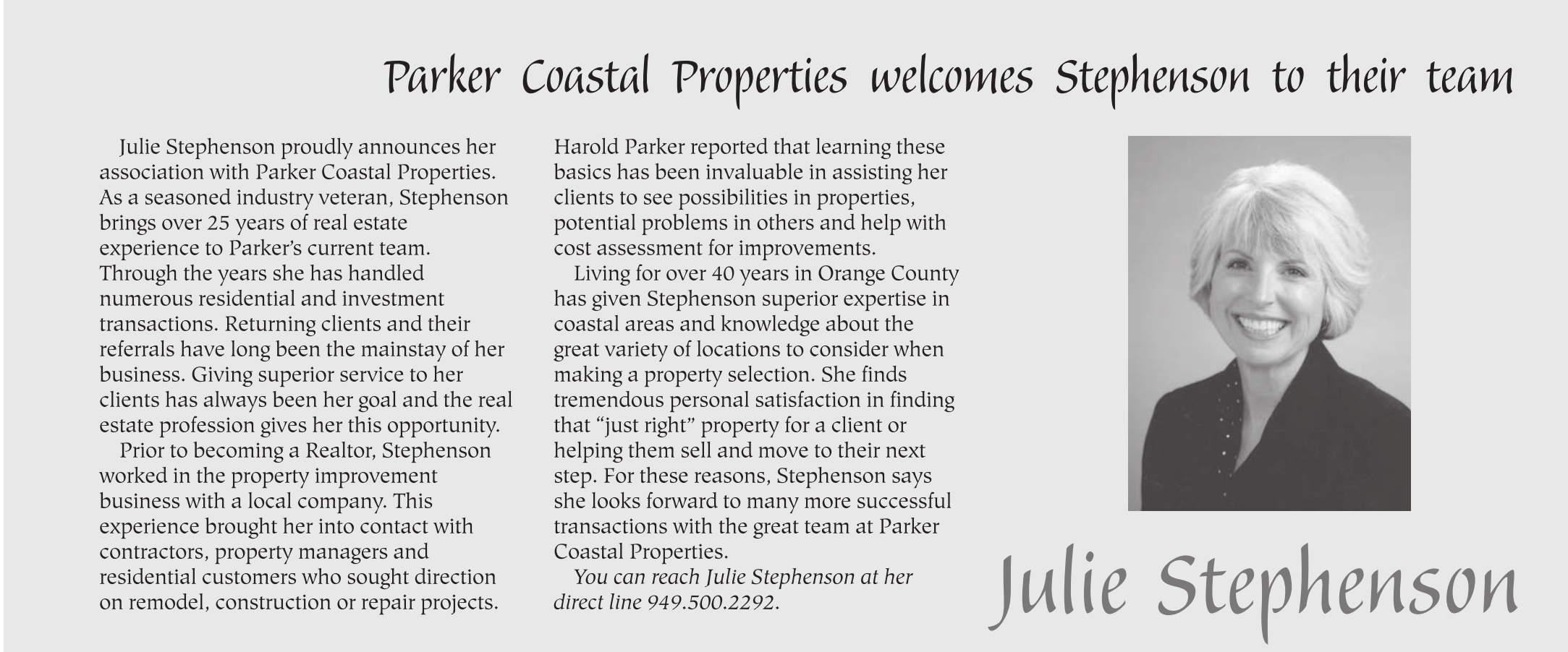 Living for over 40 years in Orange County has given Stephenson superior expertise in coastal areas and knowledge about the great variety of locations to consider when making a property selection. She finds tremendous personal satisfaction in finding that “just right” property for a client or helping them sell and move to their next step. For these reasons, Stephenson says she looks forward to many more successful transactions with the great team at Parker Coastal Properties.