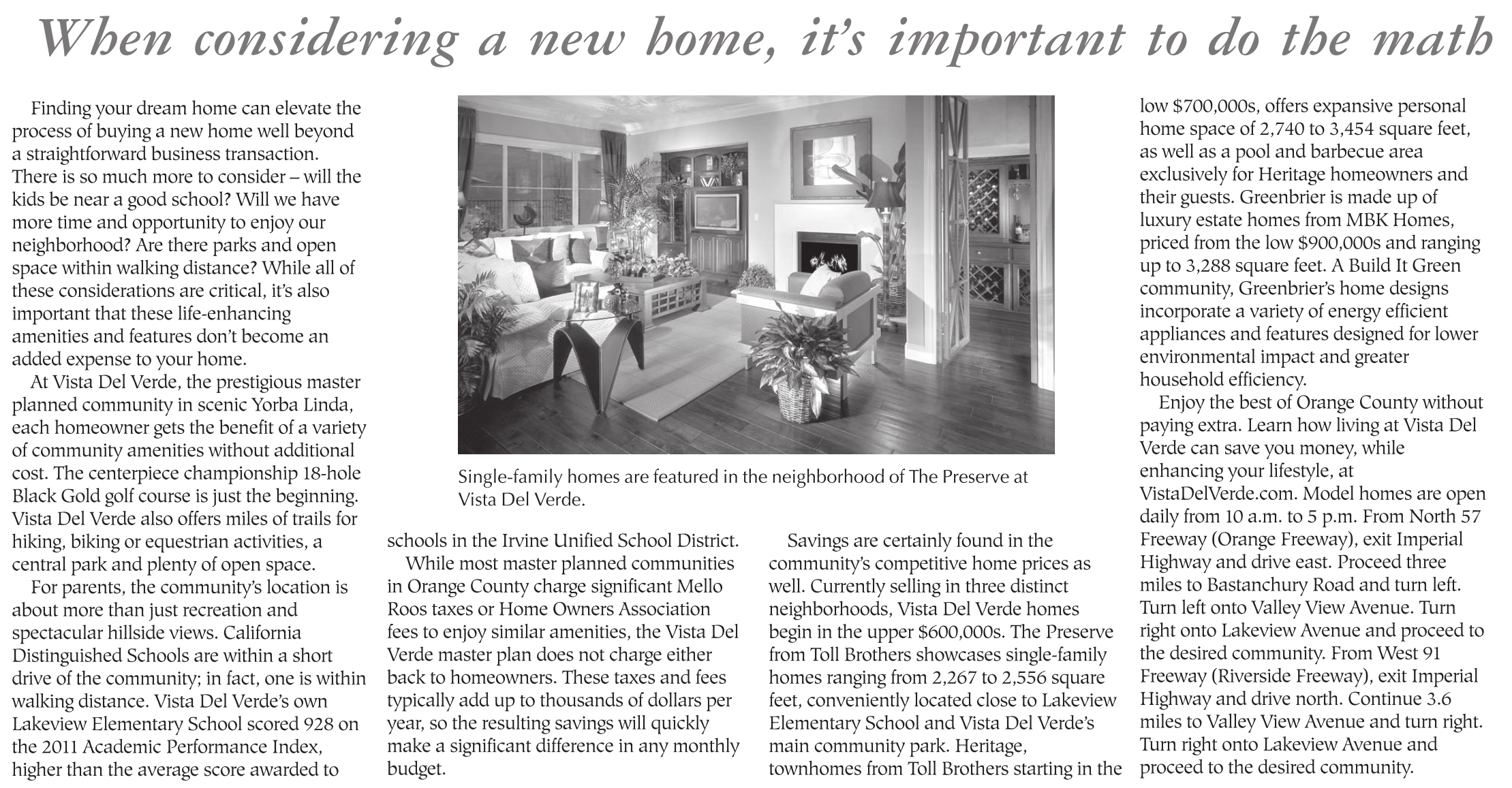 Enjoy the best of Orange County without paying extra. Learn how living at Vista Del Verde can save you money, while enhancing your lifestyle, at VistaDelVerde.com. Model homes are open daily from 10 a.m. to 5 p.m. From North 57 Freeway (Orange Freeway), exit Imperial Highway and drive east. Proceed three miles to Bastanchury Road and turn left. Turn left onto Valley View Avenue. Turn right onto Lakeview Avenue and proceed to the desired community. From West 91 Freeway (Riverside Freeway), exit Imperial Highway and drive north. Continue 3.6 miles to Valley View Avenue and turn right. Turn right onto Lakeview Avenue and proceed to the desired community.