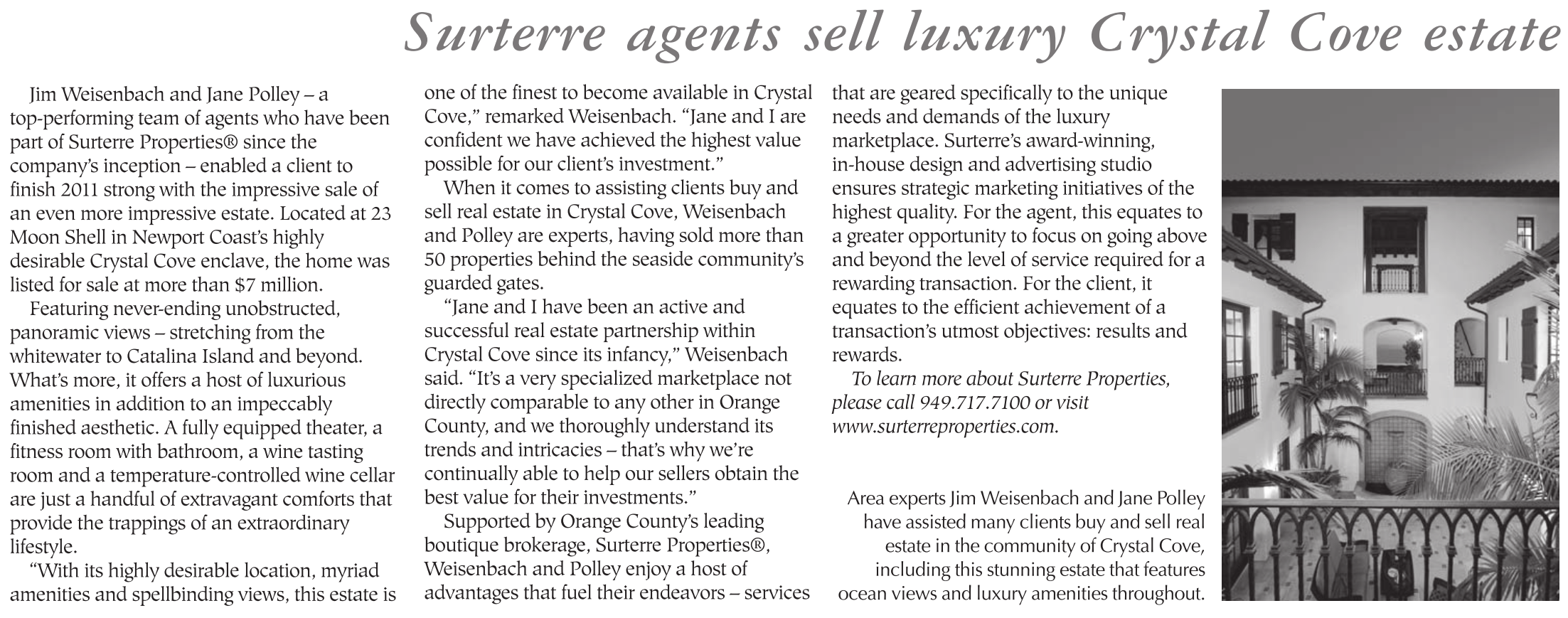 Jim Weisenbach and Jane Polley – a top-performing team of agents who have been part of Surterre Properties® since the company’s inception – enabled a client to finish 2011 strong with the impressive sale of an even more impressive estate. Located at 23 Moon Shell in Newport Coast’s highly desirable Crystal Cove enclave, the home was listed for sale at more than $7 million.