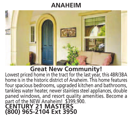 ANAHEIM Great New Community! Lowest priced home in the tract for the last year, this 4BR/3BA home is in the historic district of Anaheim. This home features four spacious bedrooms, upgraded kitchen and bathrooms, tankless water heater, newer stainless steel appliances, double paned windows, and resort quality amenities. Become a part of the NEW Anaheim! $399,900. CENTURY 21 MASTERS (800) 965-2104 Ext 3950 See also