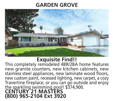 GARDEN GROVE Exquisite Find!! This completely remodeled 4BR/2BA home features new granite counters, new kitchen cabinets, new stainless steel appliances, new laminate wood floors, new custom paint, recessed lighting, new carpet, a cozy Travertine fireplace, or you can go outside and enjoy the sparkling swimming pool! $374,900. CENTURY 21 MASTERS (800) 965-2104 Ext 3920
